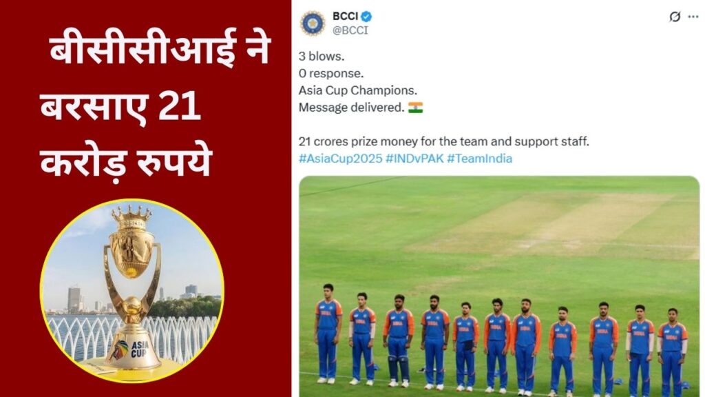 भारतीय टीम की इस शानदार उपलब्धि पर बीसीसीआई (भारतीय क्रिकेट कंट्रोल बोर्ड) ने खिलाड़ियों और सहयोगी स्टाफ के लिए 21 करोड़ रुपये की इनामी राशि का ऐलान किया। बोर्ड ने अपने आधिकारिक पोस्ट में लिखा – “3 वार. 0 प्रतिक्रिया. एशिया कप चैंपियन. संदेश दिया. टीम और सहयोगी स्टाफ के लिए 21 करोड़ रुपये की पुरस्कार राशि।”