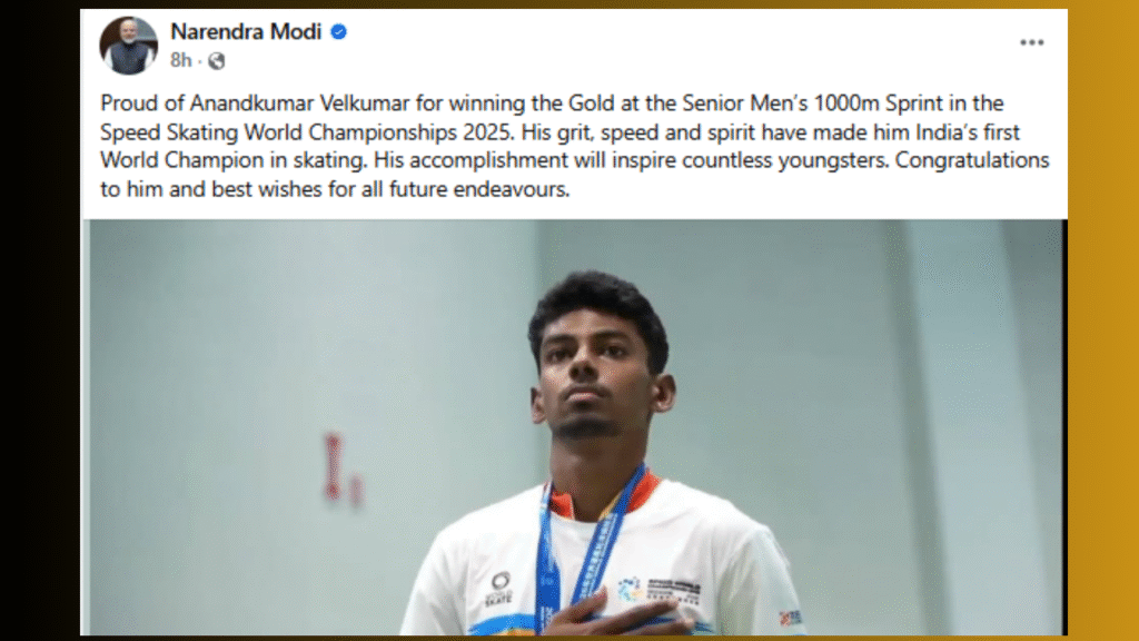 “स्पीड स्केटिंग वर्ल्ड चैंपियनशिप 2025 में सीनियर मेन्स 1000 मीटर स्प्रिंट में गोल्ड मेडल जीतने वाले आनंदकुमार वेलकुमार पर गर्व है। उनके धैर्य, गति और जज्बे ने उन्हें भारत का पहला वर्ल्ड चैंपियन बनाया है। उनकी यह उपलब्धि अनगिनत युवाओं को प्रेरित करेगी। उन्हें बधाई और भविष्य के सभी प्रयासों के लिए शुभकामनाएं।”